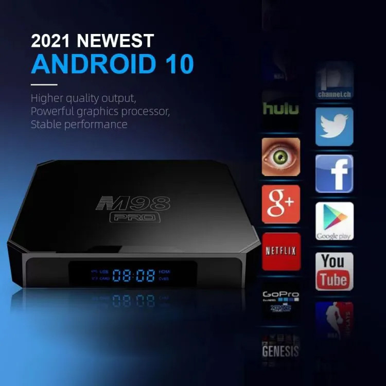 اندروید باکس M98 Pro از جمله اندروید باکس های پر فروش در بازار جهانی است.این اندروید باکس دارای حافظه داخلی 16 گیگ و رم 2 گیگ است ترکیب خوبی را همراه با CPU پر قدرتAllwinner H313 Quad Core ARM Cor-tex A53 را تشکیل داده تا برنامه های اندروید را با سرعت بالا و بدون هیچ گونه هنگی برای شما به اجرا در آورد .پس اگر دنبال تبدیل کردن تلویزیون خود به تلویزیون هوشمند هستید یا اگر تلویزیون اندروید دارید و دنبال پکیج اندروید باکس بهتری هستید اندروید باکس M98 Pro بهترین انتخاب برای شماست.این اندروید باکس کیفیت تصویر 4K را برای تلویزیون هایی که از تکنولوژی 4K پشتیبانی می کنند فراهم میکند.ورژن اندروید این اندروید باکس 10 می باشد با ناحیه و رابط کاربری بسیار جذاب ، همچنین این اندروید باکس دارای بلوتوث ورژن 4 می باشد.این اندروید باکس از سخت افزار گرافیکی Mali G31 بهره برده است تا تصاویر باکیفیت برای شما به اجرا درآیند.ماژول WIFI به کار رفته در این اندروید باکس در کلاس5G/2.4G;IEEE 802.11 b/g/nمی باشد که خود گواه سرعت بالا انتقال داده آن است.