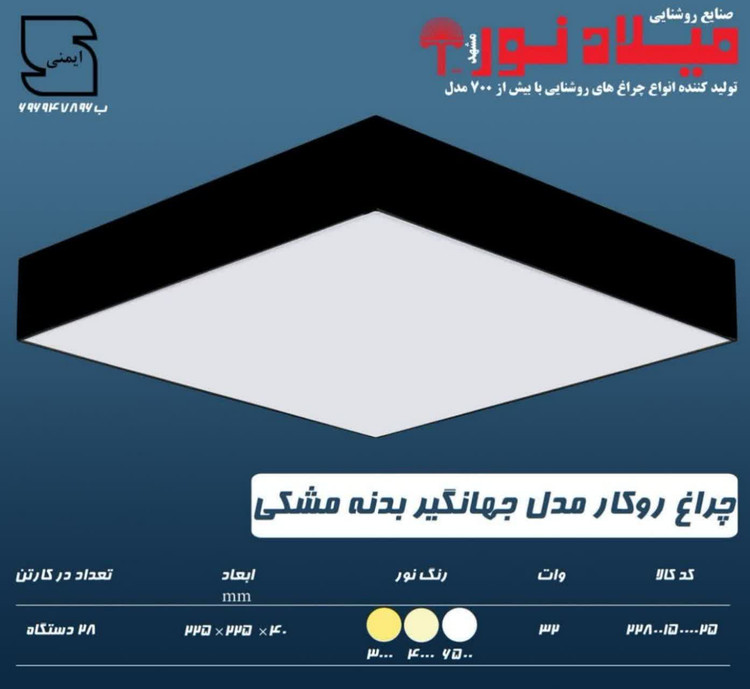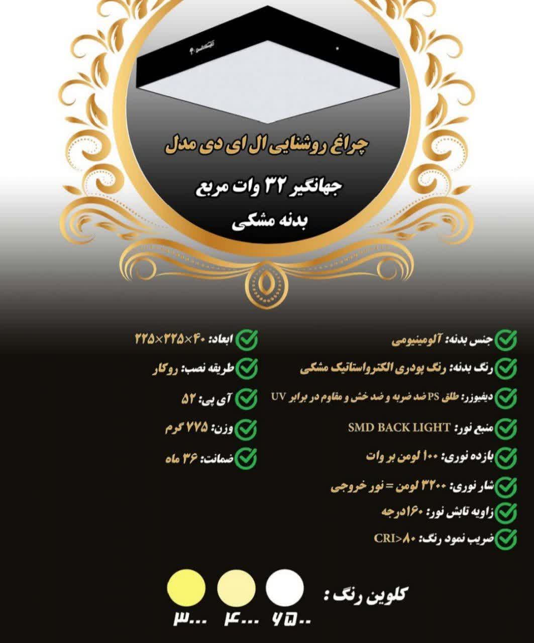 چراغ روکار جهانگير 32 وات ال اي دي LED مربع بدنه مشکي آلومينيومي ابعاد 225*225 ميلي متر کلوين 6500 با درايور ايزوله با 3 سال ضمانت