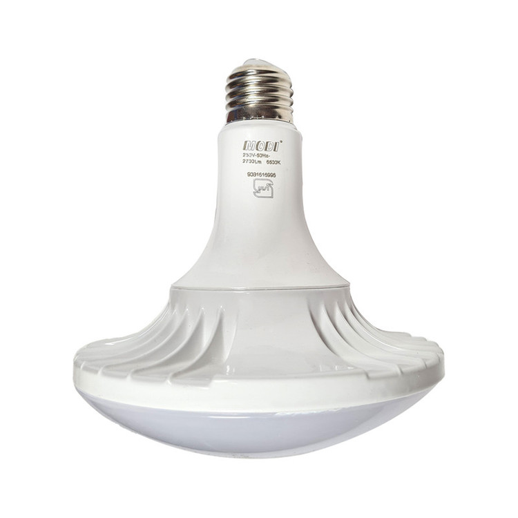 لامپ سفینه ای ۵۰ وات مودی یا به اصطلاح لامپ قارچی یکی از محصولات تولیدی شرکت « مودی » ( MODI ) است که تحت عنوان مدل « IR-MD1150 » و در دو رنگ نور آفتابی ( ۳۰۰۰ ) و مهتابی ( ۶۵۰۰ ) به بازار عرضه میشود. این لامپ راندمان بالایی دارد و بیشترین مقدار انرژی مصرفی را صرف تولید نور میکند ؛ ازاینرو حرارت تولیدی کمی دارد. این محصول توانسته در ردهی انرژی A+ قرار گیرد و در کنار این راندمان مناسب، از طول عمر بالایی برخوردار است. همچنین این محصول دارای نشان استاندارد بوده و دارای یک سال ضمانت می باشد. طول عمر این محصول ۲۵۰۰۰ ساعت بوده و کیفیت ساخت مناسبی دارد. از دیگر مشخصات این لامپ میتوان به پایهی E27 آن اشاره کرد که برای نصب روی سرپیچهای معمولی و رایج کشور مناسب است. حباب قرارگرفته روی این لامپ مقاومت بالایی در برابر ضربه دارد و میتوان آن را در مکانهایی که احتمال برخورد ضربه با لامپ وجود دارد، استفاده کرد. این محصول موفق به اخذ استاندارد RoHS شده و دلیل آن استفادهنکردن از عناصر مضر سرب و جیوه در ساخت لامپ است. نور خروجی این محصول معادل یک لامپ ۴۵۰ وات رشتهای اندازهگیری شده است.