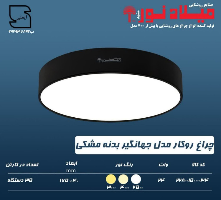 چراغ 24 وات گرد آلومینیومی لوکس بدنه مشکی میلادنور