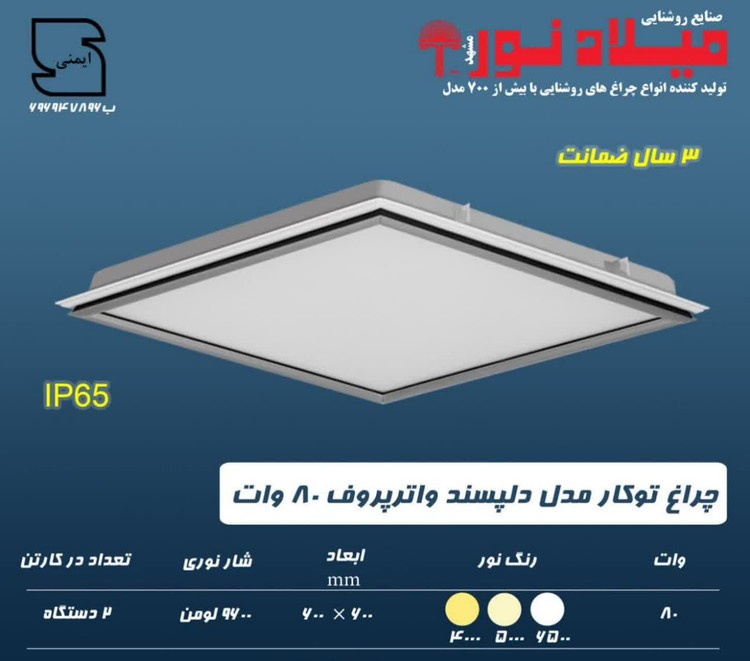 چراغ توکار واترپروفIP65توکاردلپسند 80 وات ال اي دي LED شار نوري 9600 لومن آي پي 65 ابعاد 60*60 با طلق اکريليک کلوين 4000 درب آلومينيومي با 5 سال ضمانت